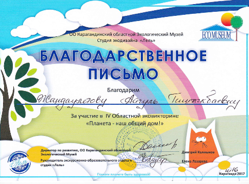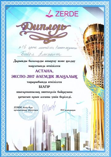 Дарынды балаларды анықтау және қолдау мақсатында "Астана, ЭКСПО-2017 әлемдік жаңалық" тақырыбында өткізілген "Білгір" шығармашылық зияткерлік байқауына қатысып, жүлделі орындарға…