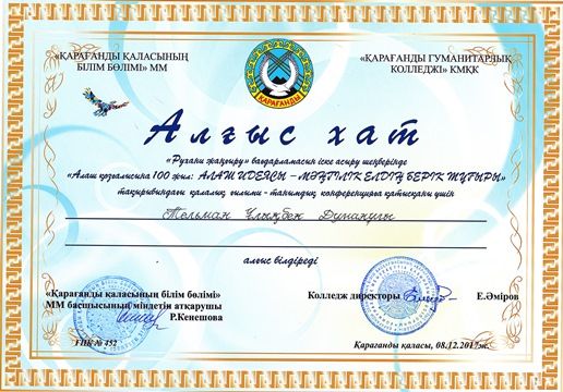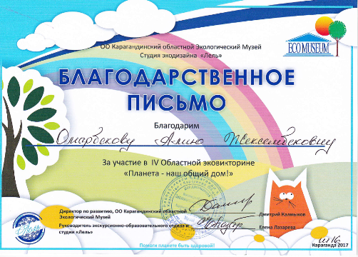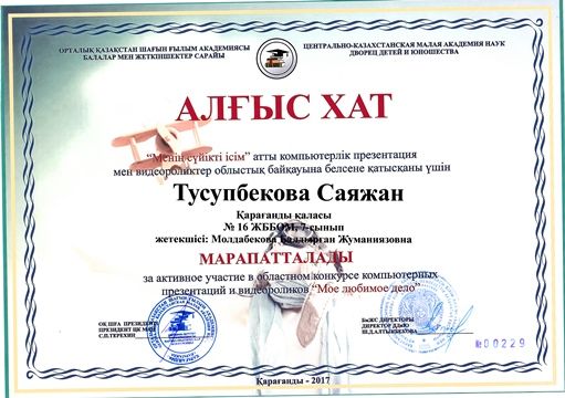"Менің сүйікті ісім" атты компьютерлік презентация мен видеороликтер облыстық байқауына белсене қатысқаны үшін мектеп оқушылары Алғыс хатпен марапатталды.