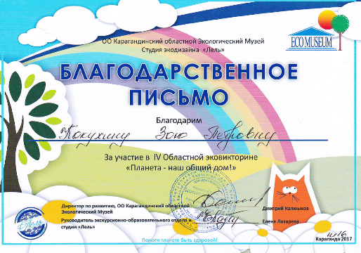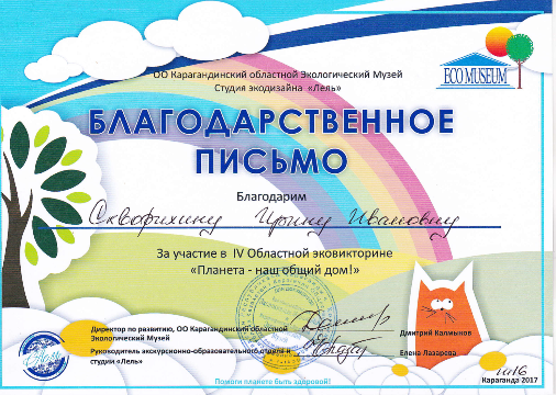 За участие IV областном эковикторине "Планета-наш общий дом!" дипломами, благодарственным письмами награждаются СОШ №16 и учителя начальных классов.