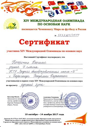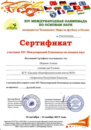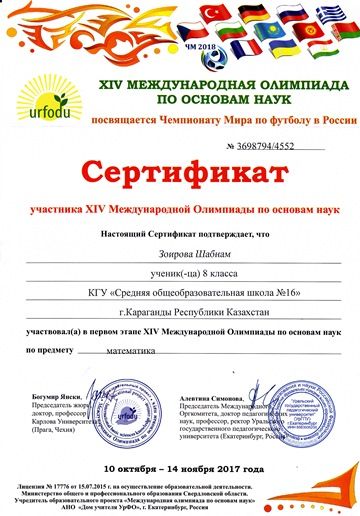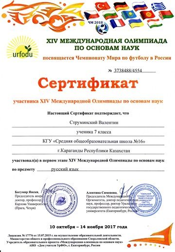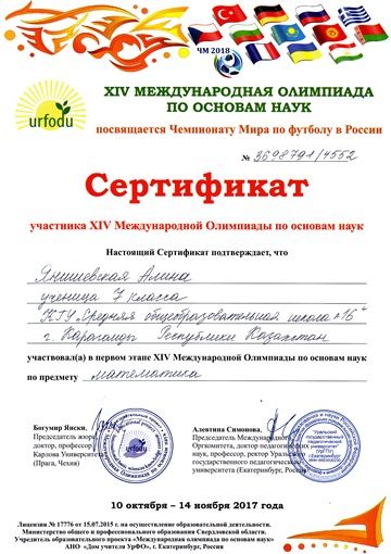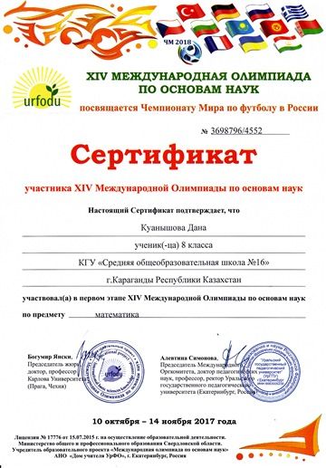 Учащихся СОШ №16 награждены сертификатами за участие в первом этапе ХІV международной олимпиады по основам наук.