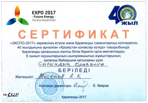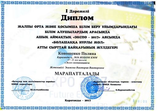 Мектебіміздің 10Б сынып оқушысы Коношенко Полина ашық аймақтық "ЭКСПО-2017" аясында өткен "Болашаққа нұрлы жол" атты сырттай байқауға қатысып, "Эссе" номинациясы бойынш…