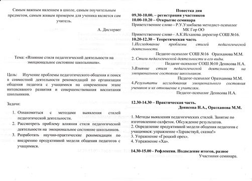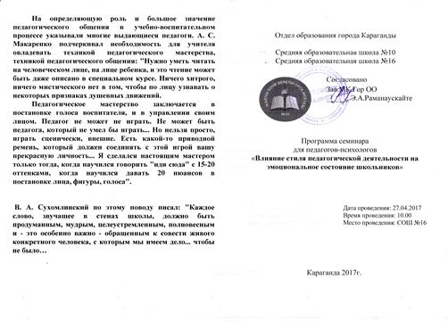 27.04.2017 г в стенах школы был организован городской семинар для педагог-психологов. Тема семинара: "Влияние стиля педагогической деятельности на эмоциональное состояние школьников". Семи…
