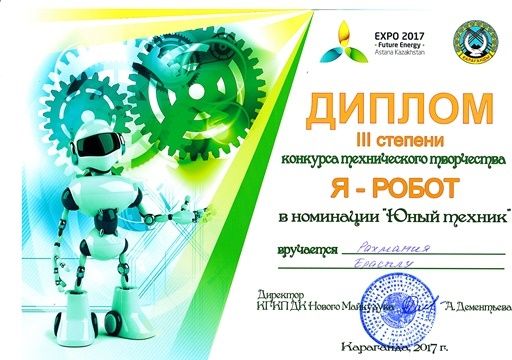 Дипломы за участие конкурса технического творчества "Я робот" вручается Бахыт Нургельды, Рахмания Ерасылу, Щукину Максиму. Руководитель: учитель информатики Е.У.Аязбеков.