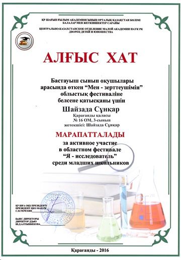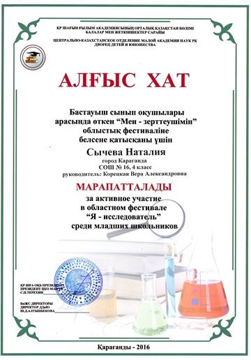 Бастауыш сынып оқушылары арасында өткен "Мен-зерттеушімін" облыстық фестиваліне белсене қатысқаны үшін 2 сынып оқушысы Кругова Елизавета (жетекшісі Васенова Е.А), 3 сынып оқушысы Шай…
