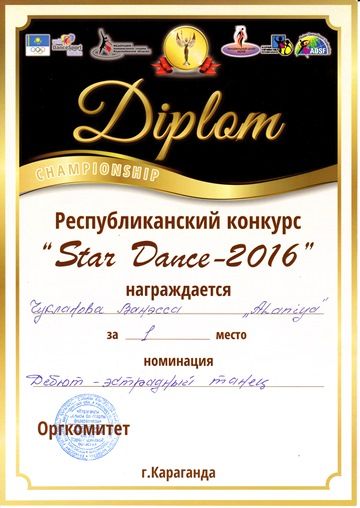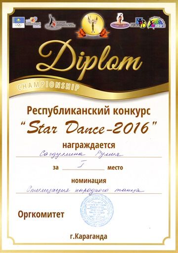За занятое 1 место в Республиканском конкурсе "STAR DANCE-2016". дипломом награждается
