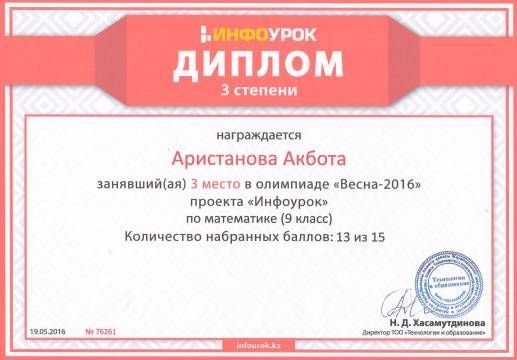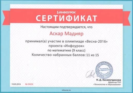 Учащиеся 9 класса приняли участие в международной дистанционной олимпиаде проекта "Инфоурок" (сезон "Весна-2016") по предметам математика.