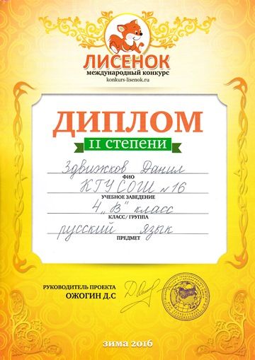Учащийся 4В класса Здвижков Данил награждается дипломом ІІ степени. Благодарственным письмом награждена учитель начальных классов Лагутина Е.Н.