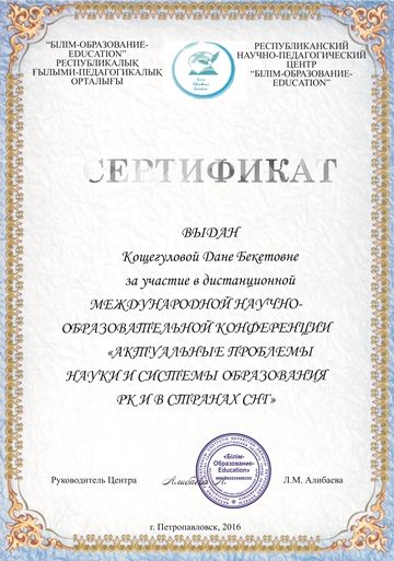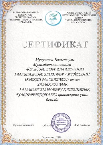 Сертификат выдан учителю истории Мукушевой Б.М. и учителю русского языка и литературы Кощегуловой Д.Б. за участие в международной дистанционной конференции "ҚР және ТМД елдеріндегі ғылым және б…