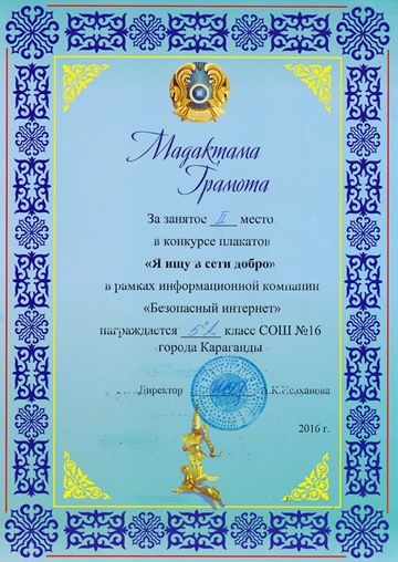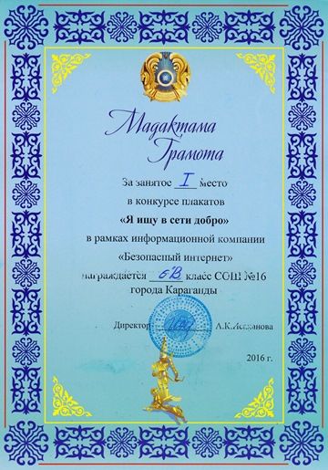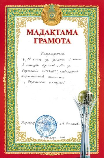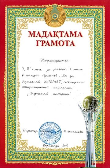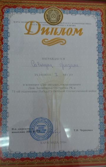 Дипломом награждается ученик 10А класса Сагындык Оразали за занятое І место в конкурсе "Две звезды" посвященного Дню Защитника Отечества РК и 71-ой годовщине Победы в великой Отечественной…