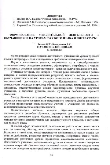 Опубликована статья учителя начального класса Бекова Ж.Т на тему: "Формирование мыслительной деятельности у обучающихся уроках русского языка и литературы" на с…