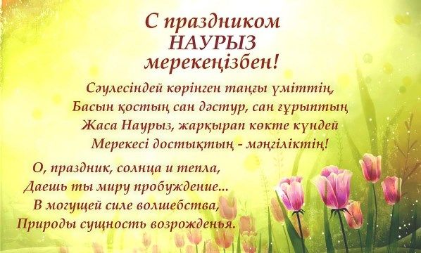 Сердечно поздравляем вас с праздником весеннего обновления – Наурыз! Пусть праздник Наурыз войдет в Ваш дом хорошим весенним настроением, щедрым дастарханом и радостью! Желаем добра и согласия…