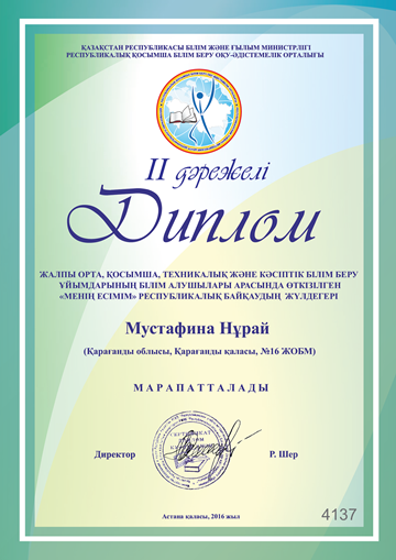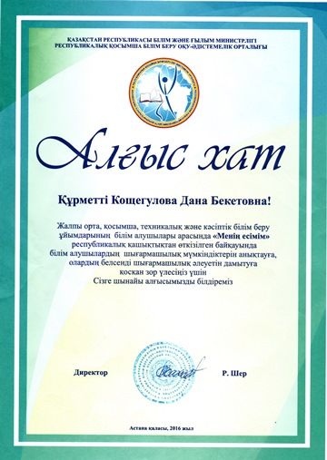 Поздравляем Мустафину Нұрай ученицу 7А класса, с победой ( 2 место) в Республиканском дистанционном творческом конкурсе «Имя мое», Женис Акботу ученицу 9А класса,…