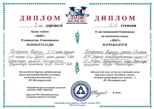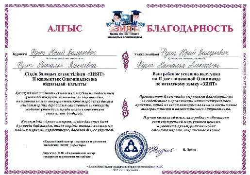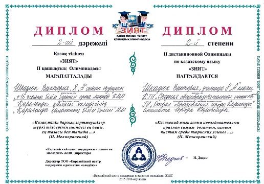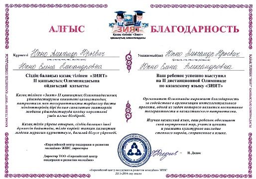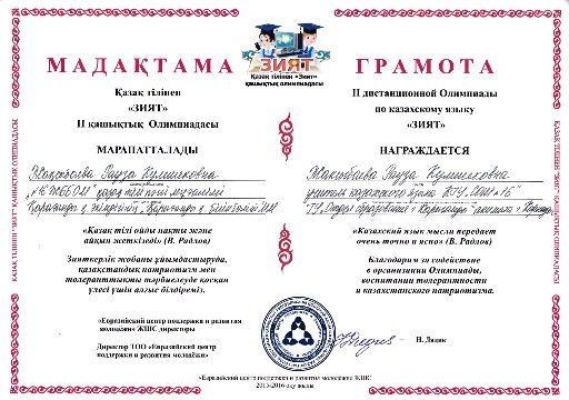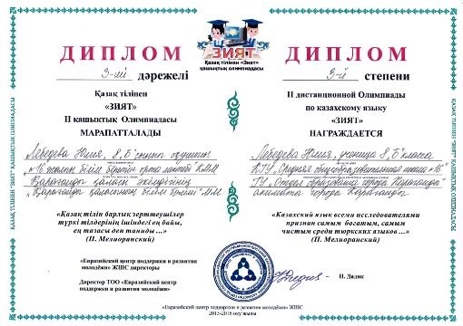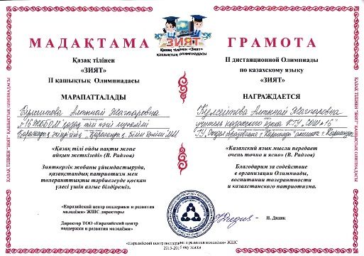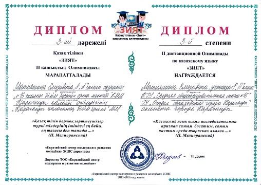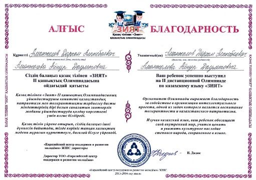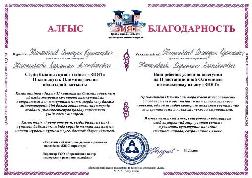 Поздравляем призеров ІІ дистанционной олимпиады по казахскому языку "Зият"! Благодарственными письмами и грамотами отмечены родители и учителя-предметники.