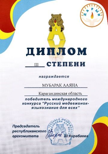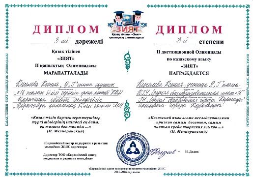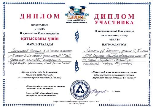 Дипломом ІІ степени за лучшее сочинение "Мәңгілік ел" на областном конкурсе сочинении "Тәуелсіздік - қазақтың БАҚ жұлдызы" проходившего среди учащихся школ награждается ученик 4Ә…