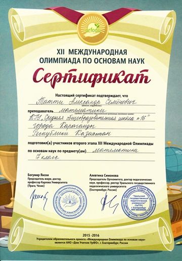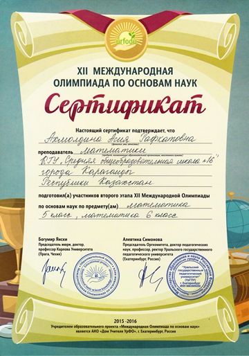 Сертификат выдан ученице 11Б класса Чебан Изабелле, занявшей V место в областной олимпиаде "Эрудит-2016" по предмету химия.