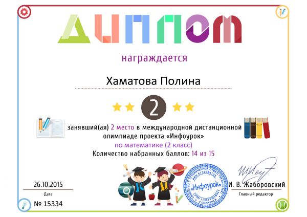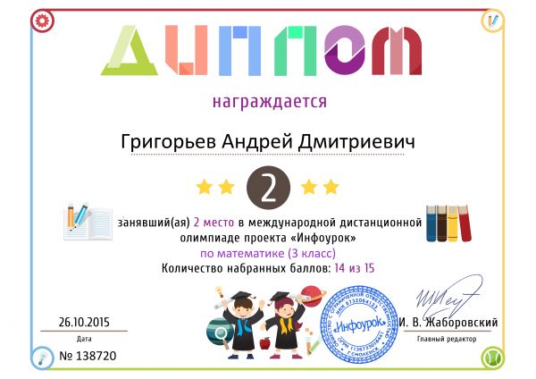 Поздравляем учащихся 3Г класса за победу, за участие в международной дистанционной олимпиады проекта "Инфоурок" по математике. Благодарственным письмом награждена классный руко…