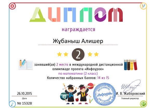 Дипломами награждены учащиеся 2Б класса Магсудов Эрвин, Шпанькова Виктория, Ахихайдар Айбар, Омаров Диас, Шпанькова Вера, Сарсен Малика, Ильинская Мария. Благодарственным письмом награждена учитель…