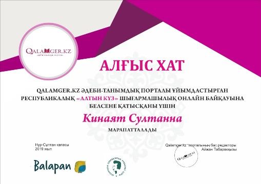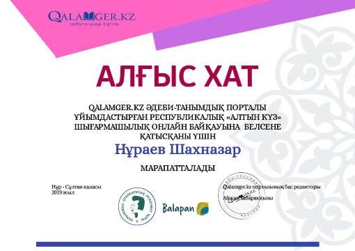 2А сынып оқушылары Qalamger.kz әдеби-танымдық порталы ұйымдастырған республикалық "Алтын күз" шығармашылық онлайн байқауына қатысып, Алғыс хаттарға ие болды. Сынып жетекшісі: Жандаул…