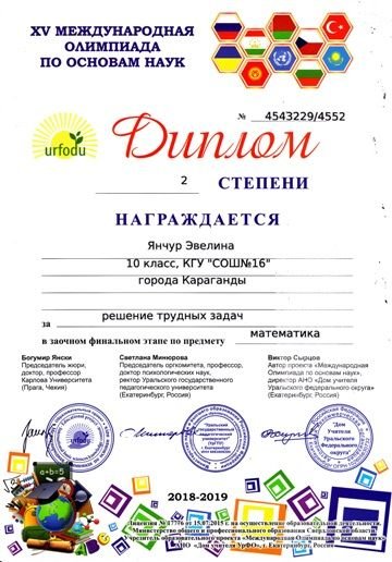 ІІІ деңгейлі диплом. 10 сынып оқушысы Янчур Эвелина.