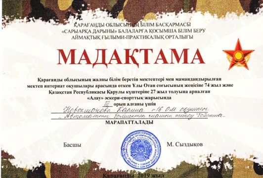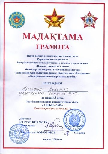 Ұлы Отан соғысының жеңісіне 74 жыл және ҚР Қарулы күштеріне 27 жыл толуына арналған "Айбын", "Алау" әскери-спорттық жарысына мектебіміздің командасы, оқушылары қатысып, марапатта…