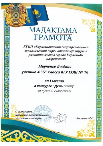 1Г сынып оқушысы Фукс У "Көктем сыңғыры" атты VII қалалық конкурсына қатысып, "Хор" номинациясы бойынша І орынға ие болды.