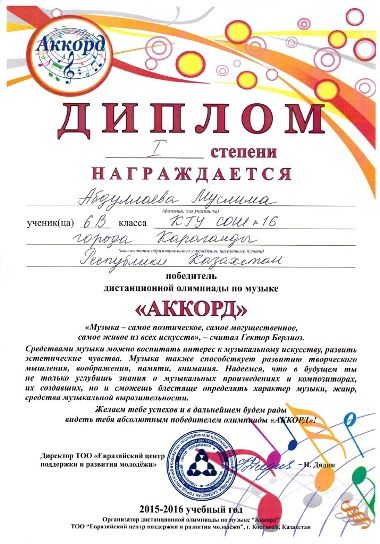 Поздравляем учащихся 4-5-6 классов за димломами І степени дистанционной олимпиады по музыке "АККОРД".