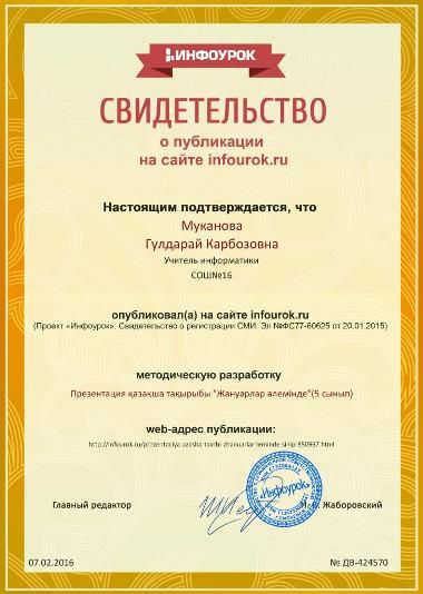 Учитель информатики Г.К.Муканова опубликовала на сайте infourok.kz методические разработки уроков.