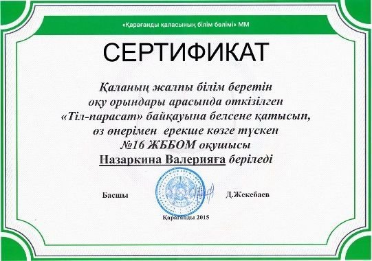 Сертификат за активное участие в конкурсе "Тіл - парасат" получила ученица 11В класса Назаркина Валерия.