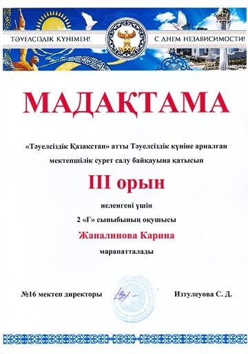 Технология және көркем еңбек пәні мұғалімі Мусенов А.К ҚР-ның Тәуелсіздігі күніне арналған "Тәуелсіздік-тұғырың" атты музей сабағына қатысып, Алғыс хатқа ие болды.