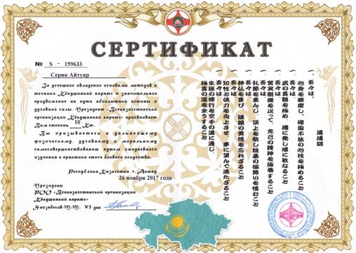 Кекушинкай каратэсінің әдіс негіздері мен техникасын жетік меңгергені үшін 2 В сынып оқушысы Серик Айтуар сертификатпен марапатталды.