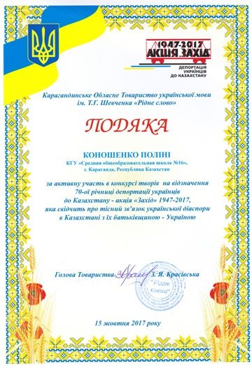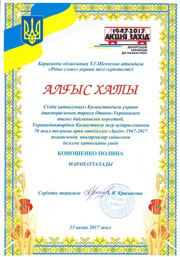 Украиндықтардың Қазақстанға жер аударылғанына 70 жыл толуына орай өткізілген "Захід" 1947-2017 акциясында шығармалар сайысына белсене қатысқаны үшін 11Б сынып оқушысы Коношенко Полина Алғы…