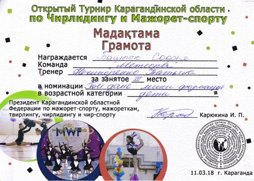 2Г сынып оқушысы Башлык Софья Қарағанды облысы бойынша Чирлидинг және Мажорет- спорт бойынша ашық турнирде ІІ, ІІІ орын алғаны үшін грамотамен марапатталды.