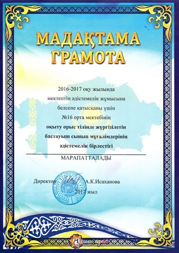 2016-2017 оқу жылында мектептің әдістемелік жұмысына белсене қатысқаны үшін оқыту орыс тілінде жүргізілетін бастауыш сынып және гуманитарлық пәндер әдістемелік бірлестіктері марапатталд…
