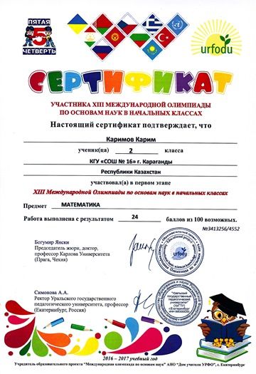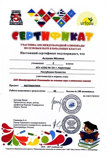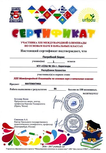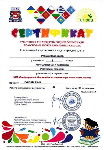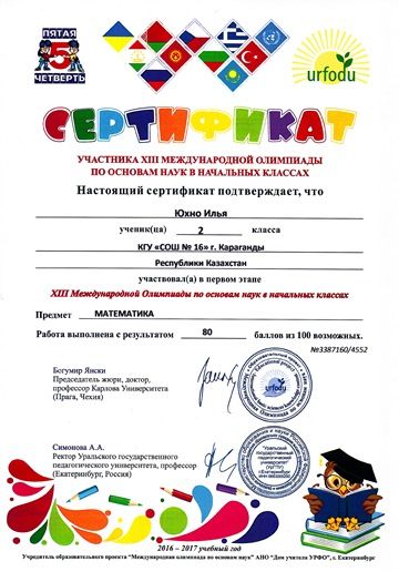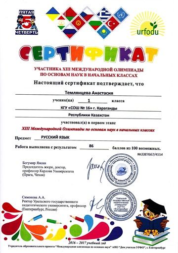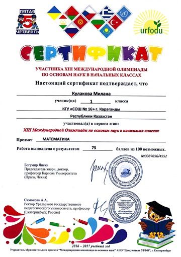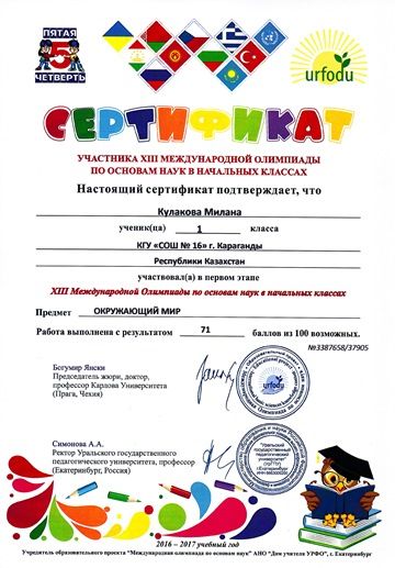 Поздравляем учащихся 1 класса с сертификатами участников первого этапе ХІІІ международной олимпиады по основам наук в начальных классах. Предметы окружающий мир, русский язык, математика.