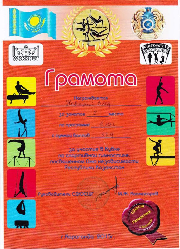 Қазақстан Республикасы Тәуелсіздік күніне арналған спорттық гимнастика бойынша Кубокта І орын алған 3Г сынып оқушысы Навицкий Владиславты құттықтаймыз. Сынып жетекшісі М.О.Турсунова