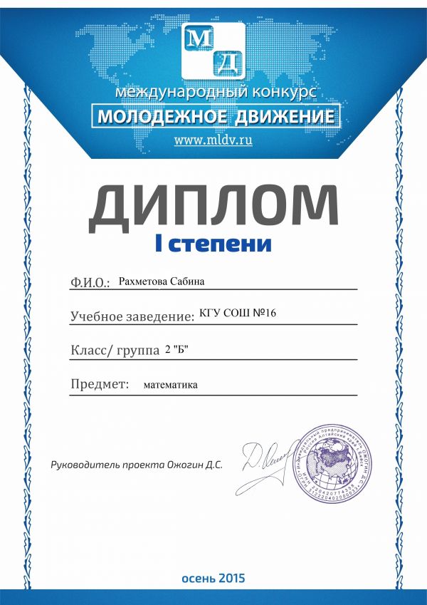 Математика пәні бойынша "Жастар қозғалысы" халықаралық байқауының жеңімпаздары мен жүлдегерлерін құттықтаймыз. Бастауыш сынып мұғалімі Ж.Т.Бекова байқауға белсене қатысқаны үшін алғыс хатп…