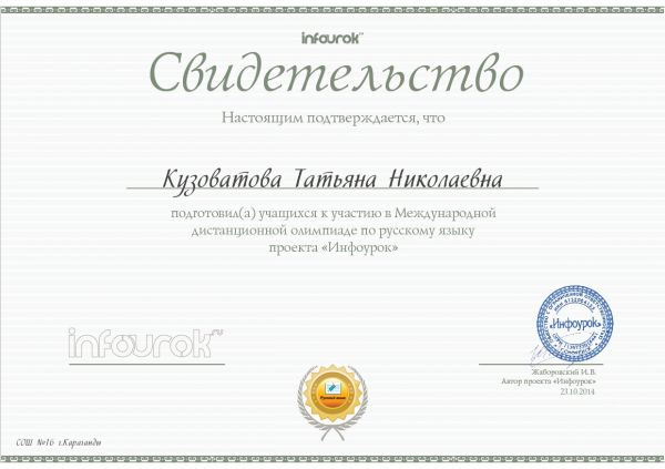 "Инфоурок" жобасының орыс тілі пәні бойынша халықаралық қашықтықтан өтетін олимпиадасындағы жеңісі үшін 9 сынып оқушыларын, сонымен қатар "Орыс тілі" пәні бойынша халықаралық қаш…