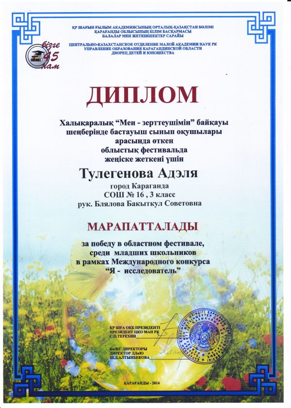 Халықаралық "Мен - зерттеушімін" байқауы шеңберіндегі бастауыш сынып оқушылары арасында өткен облыстық фестивальда жеңіске жеткені үшін 3Г сынып оқушысы Тулегенова Адэля дипломмен және бел…