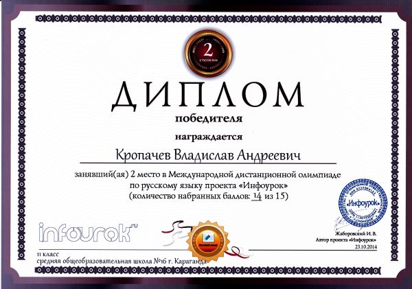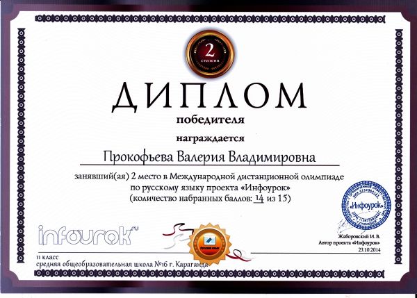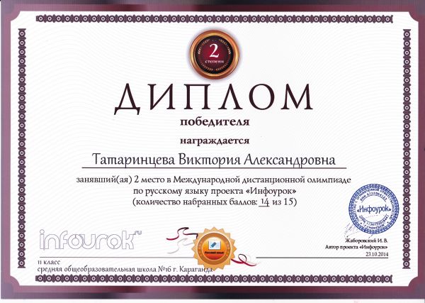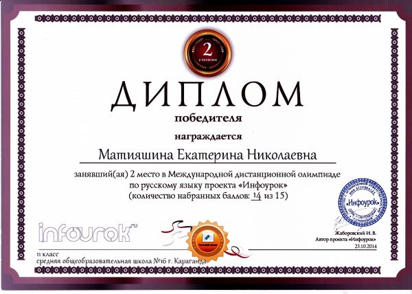 "Инфоурок" жобасының орыс тілі пәні бойынша қашықтықтан өтетін халықаралық олимпиада жеңімпаздары мен жүлдегерлерін құттықтаймыз.