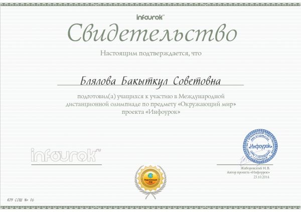 "Инфоурок" жобасының "Қоршаған әлем" пәні бойынша қашықтықтан өтетін халықаралық олимпиада жеңімпаздары мен жүлдегерлерін құттықтаймыз.