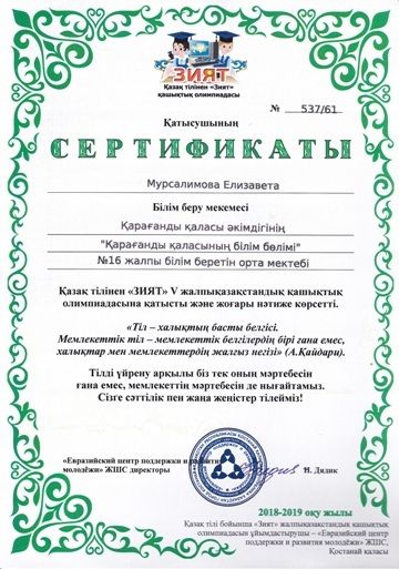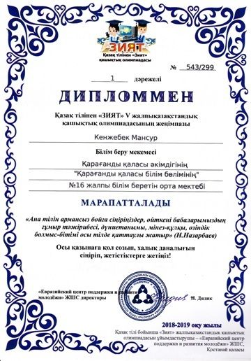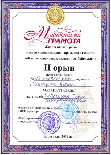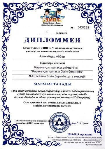 8А сынып оқушысы Амангельдиевна Диана оқушылардың Республикалық олимпиадасының ІІ қалалық кезеңінде орыс тілі мен әдебиет пәнінен ІІІ орынға ие болды. Жетекшісі: орыс тілі мен әдебиеті пәні мұғалімі…