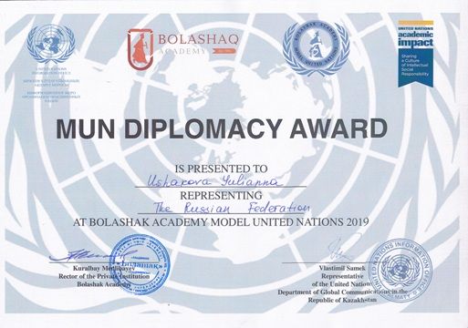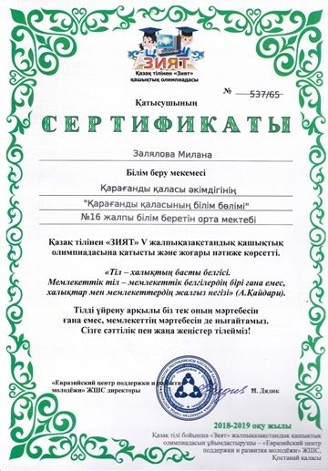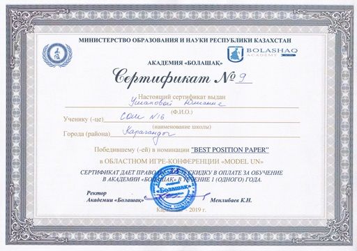 11А сынып оқушысы Укашова Юлианна "Болашақ"Академиясының ұйымдастыруымен өткен облыстық "MODELEN" ойын-конференциясына қатысып, сертификатқа ие болды.