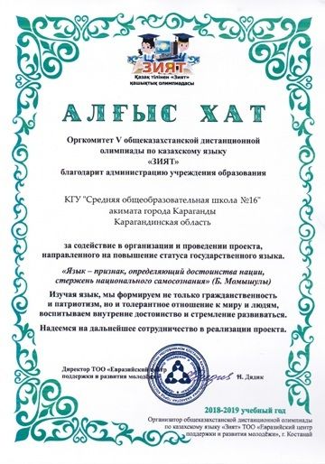 Қазақ тілі пәнінен "Зият" V жалпықазақстандық қашықтық олимпиадасына қатысқан оқушыларымыз жүлделі орындарға ие болды.