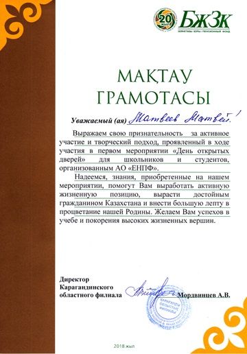 "Бірыңғай жинақтаушы зейнетақы қоры" акционерлік қоғамының ұйымдастыруымен өткен "Әр салымшы үшін қолжетімді БЖЗҚ" тақырыбындағы іс-шараға мектебіміздің 11А,Б сынып оқушылары қат…