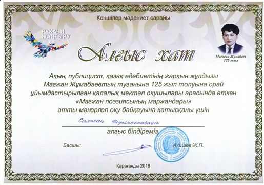 8А сынып оқушысы Түсіпбекова Саяжан Мағжан Жұмабаевтың туғанына 125 жыл толуына орай ұйымдастырылған қалалық мектеп оқушылары арасында өткен "Мағжан поэзиясының маржандары" мәнерлеп оқу ба…