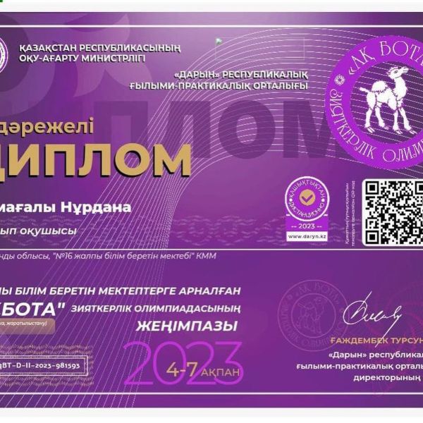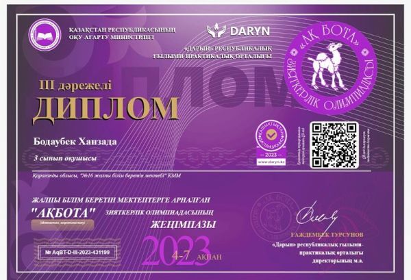 1 "д" сынып оқушылары "Ақбота" зияткерлік олимпиадасына қатысып, жүлделі орындарға ие болды. Құттықтаймыз! Сынып жетекшісі: Куленова С.А.