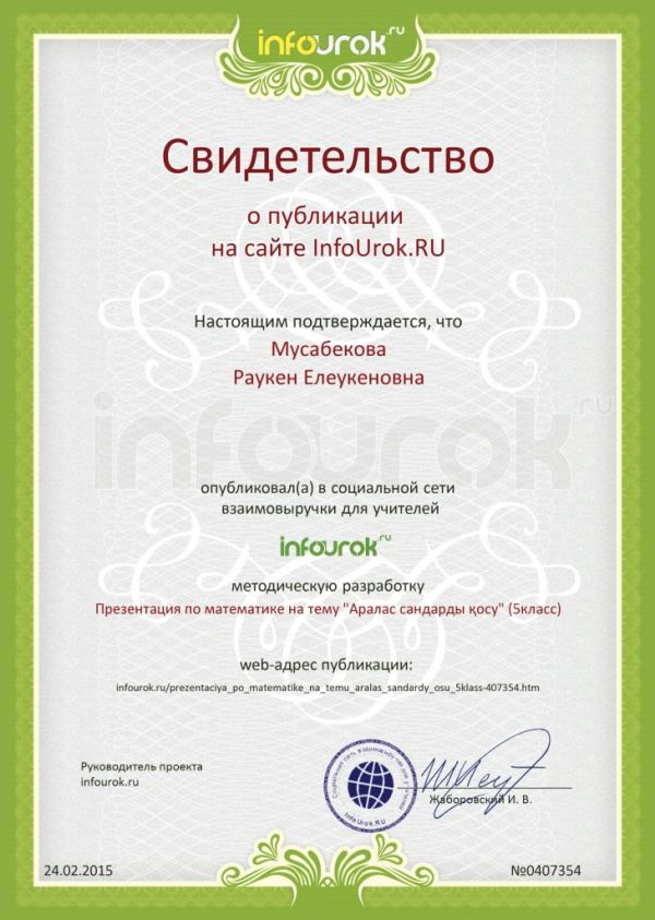 Мусабекова Раукен Елеукеновна мұғалімдерге арналған әлеуметтік желіде "Математика және үйлесімділік" мұғалім жобасын және математика пәні бойынша "Аралас сандарды қосу" пре…