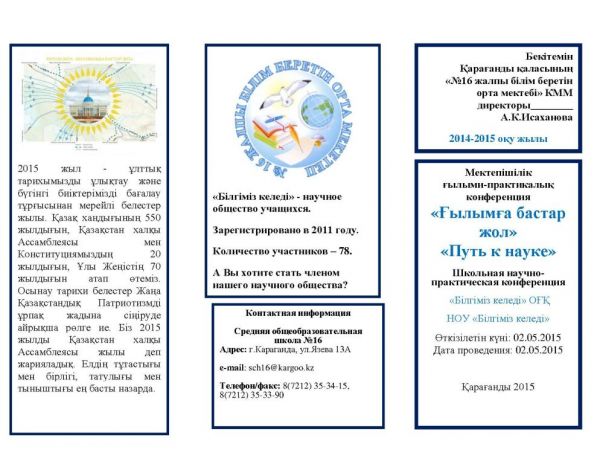 №16 жалпы білім беретін орта мектебі «Білгіміз келеді» оқушылардың ғылыми қоғамы ұйымдастырған «Ғылымға бастар жол» Мектепішілік ғылыми-практикалық конференциясы…