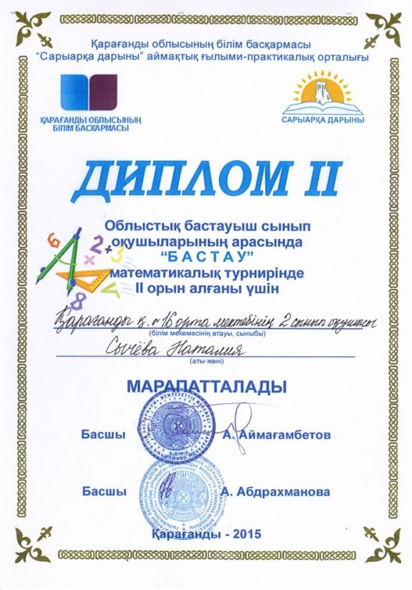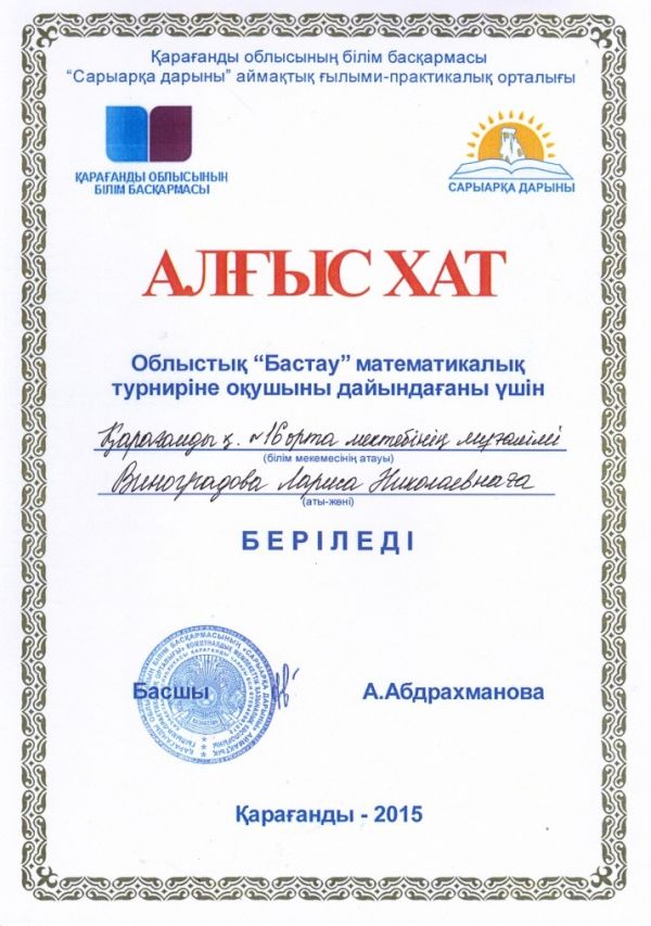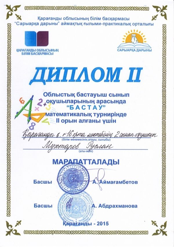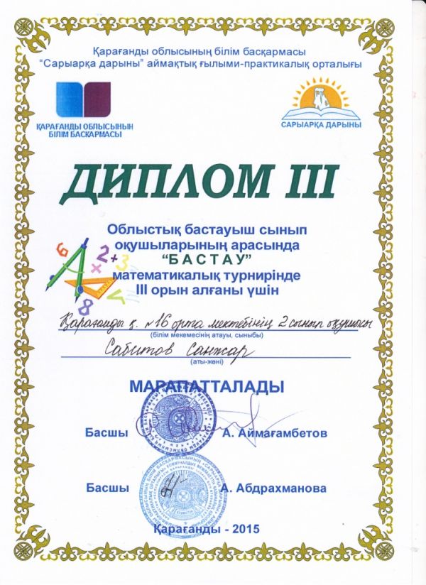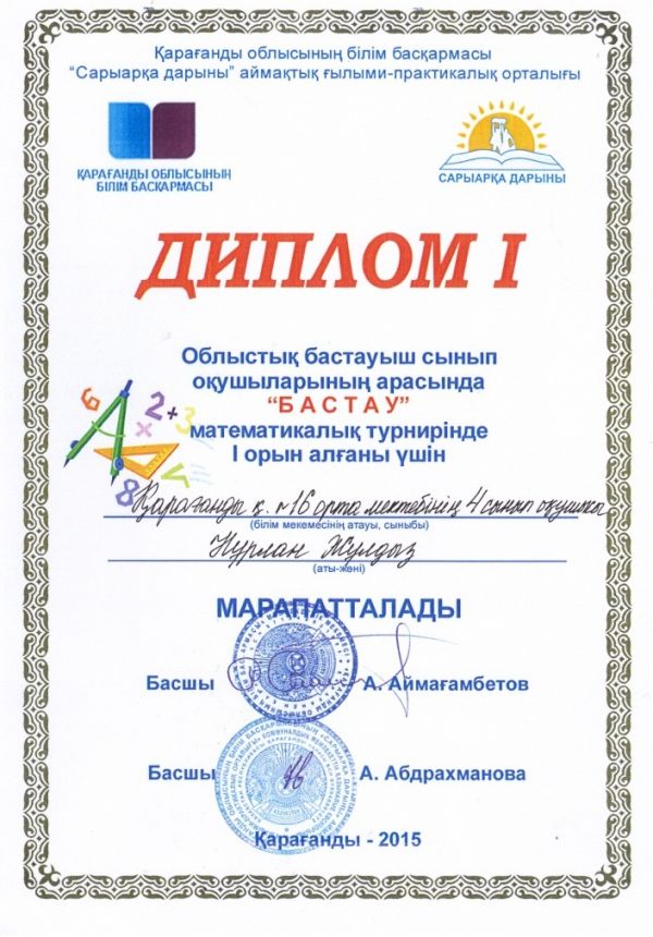 Облыстық бастауыш сынып оқушыларының арасында "Бастау" математикалық турнирінде І орын алғаны үшін 4а сынып оқушысы Нұрлан Жұлдыз бен 2сынып оқушысы Батура Милананы және ІІ, ІІІ орынға иел…
