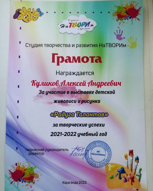 Ученик 6 Г класса Куликов Алексей был награжден грамотой за участие в выставке детской живописи и рисунка.